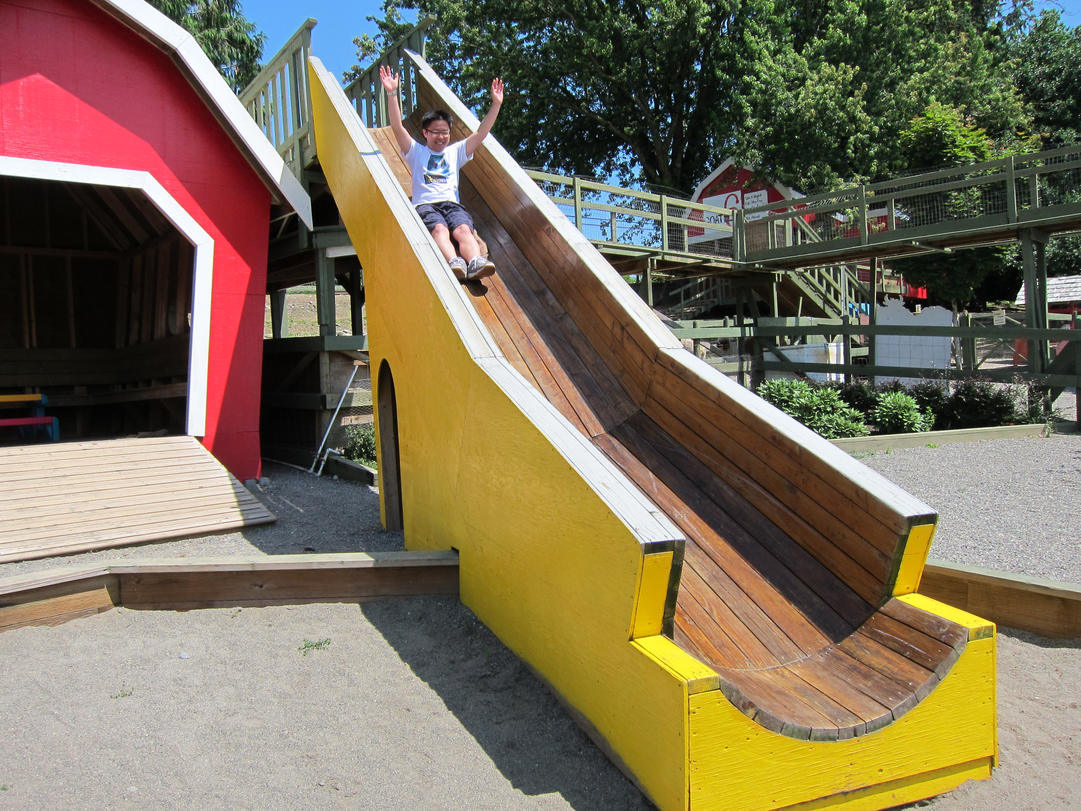 I loved the fact that the first thing I saw was a red barn-like structure that everyone associates with farms. I think I have been to farms before, but that was when I was still in elementary school and we went for pumpkin picking with our class. Anyway, we explored around a bit as we did not want to pick strawberries yet, or else they will just get gross when we leave them for long periods of time in the car. We first went to the playground. They had a wooden slide. Yeah, wooden. At first we were thinking you would have to be crazy to slide down a wooden slide, but then we saw the burlap potato sacks they left around the base of the slide which you are supposed to sit on while sliding down.