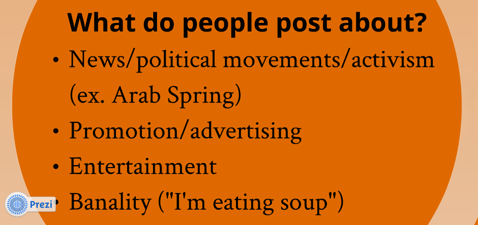 According to my Creative Writing for New Media class, here are the four basic things people tweet about: