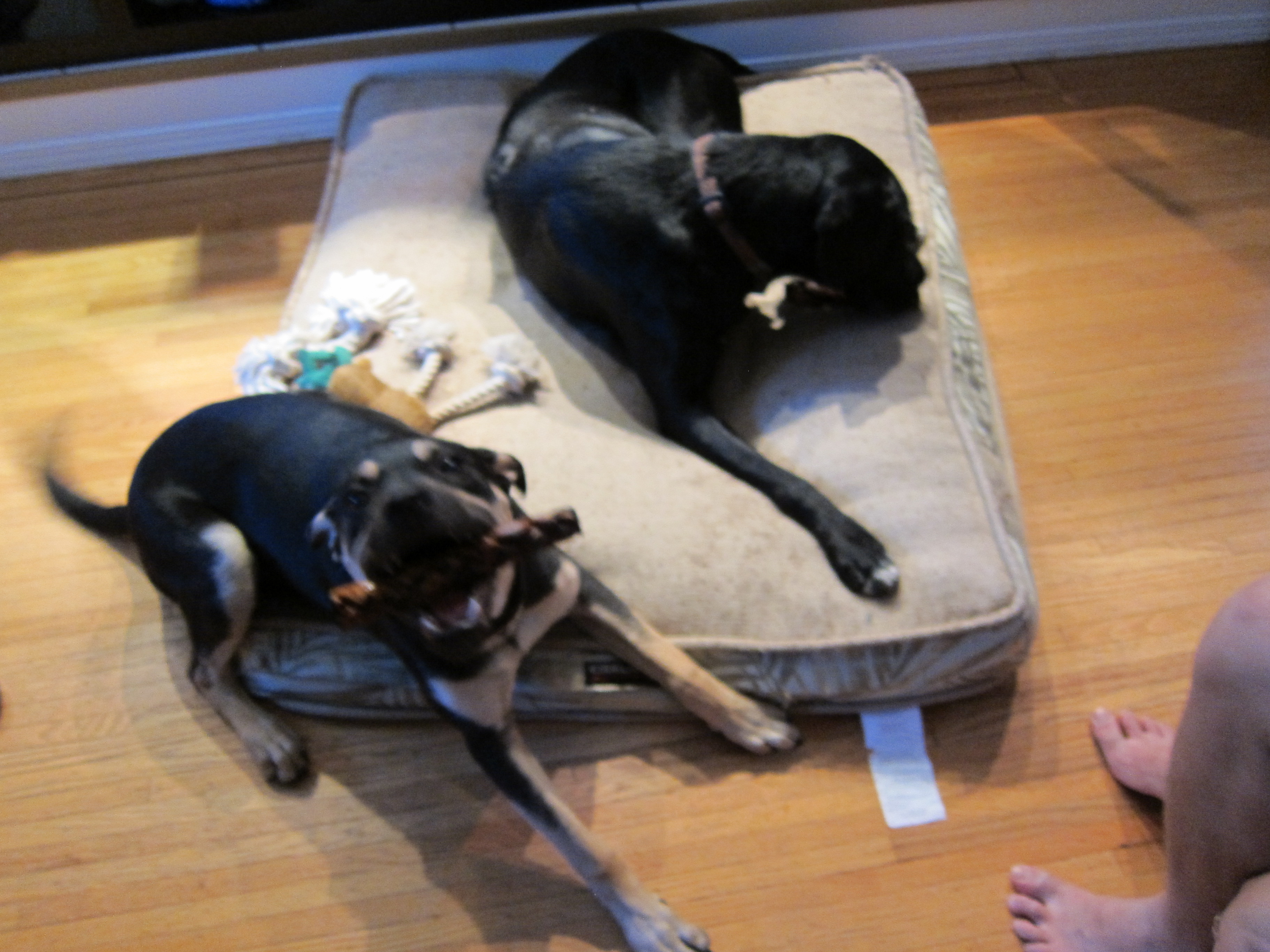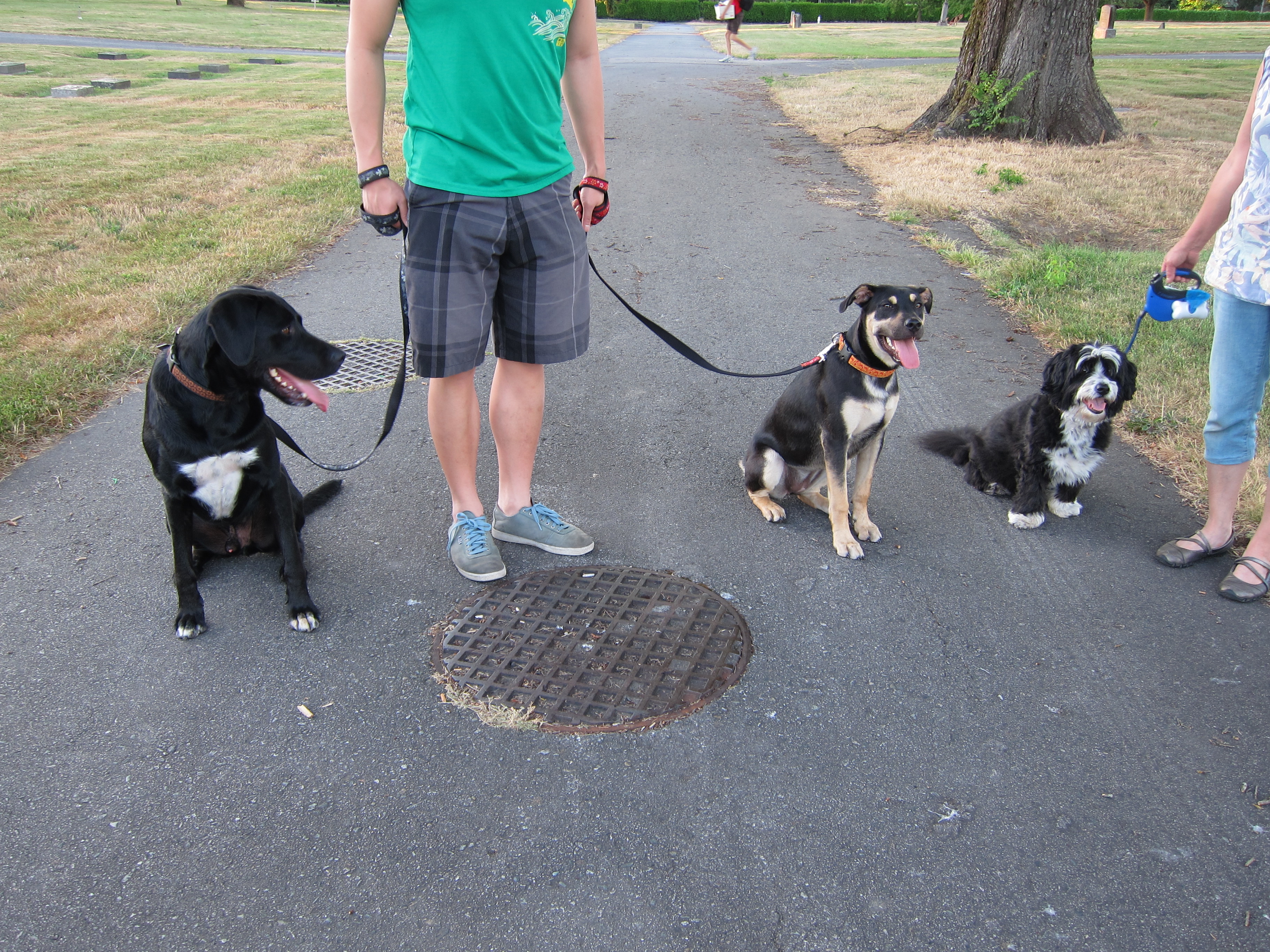 Anyway, a little later on, we took them for a walk so they could do their business. Ollie (the brown & black dog) was quite a handful, but she was my responsibility because Tommy (the jet black one) would be too strong if he bolted after something, so my boyfriend took his leash. My boyfriend’s mom took Rascal…and I didn’t want to compete with her because Rascal would get hurt if she walked somedog else.