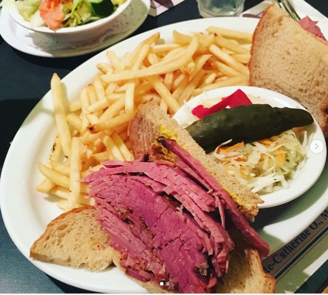 There are two locations for Reuben’s downtown, both fairly close to one another. When you order a smoke meat sandwich here, you’ll also get half a pickle, coleslaw, and fries. Plus, they usually always have seats so you can settle down and relax for a bit. It’s also super conveniently located if you’re doing some shopping downtown!
