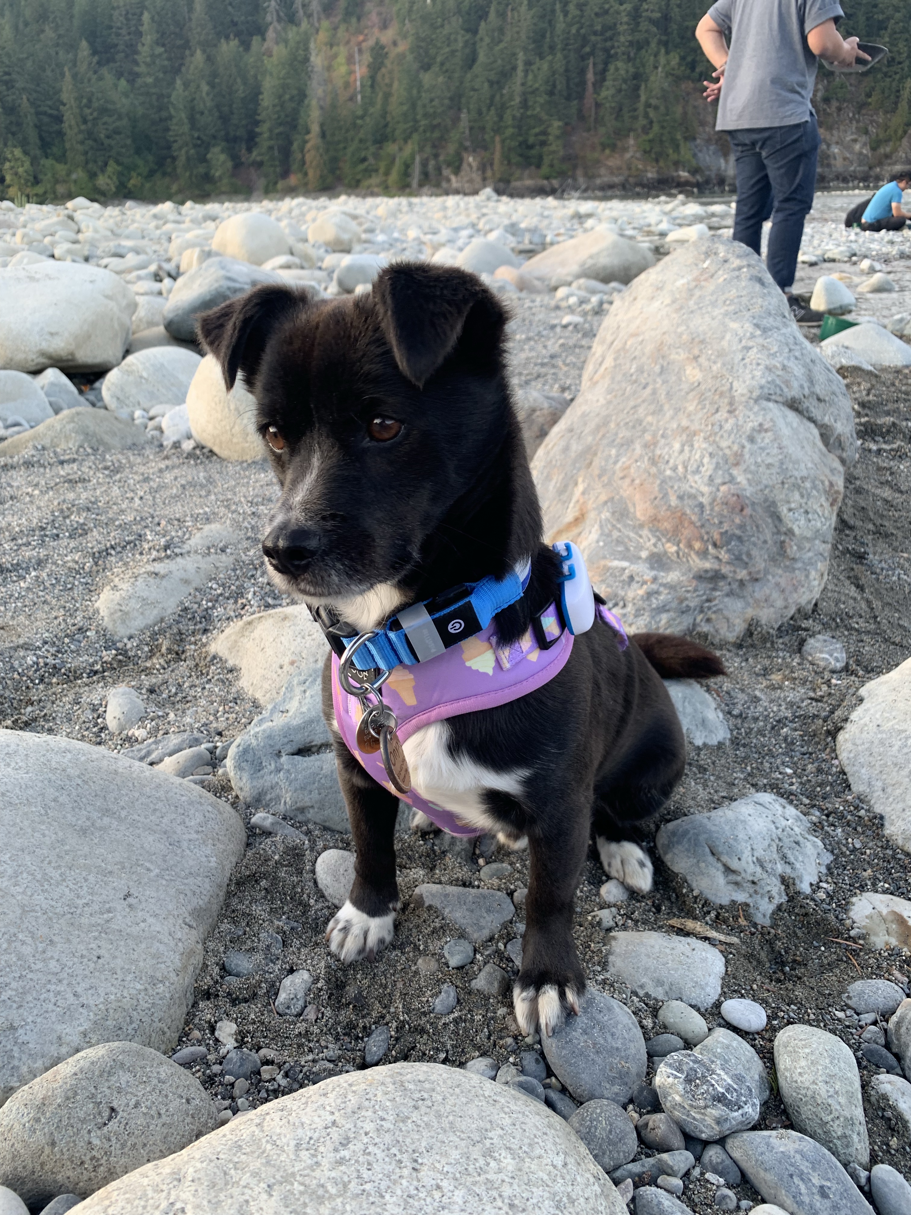 At one point, I let Onyx roam around since he was having a blast sniffing everything. Then he wandered away and I saw him from afar rolling into something on the ground. Usually, he does that when he finds a good smell. I walked towards him and saw him proudly pick up the “thing” he was rolling it. When I got closer, I smelled a pungent smell and realized he had a rotting dead fish in his mouth. I screamed at my fiancé to come and help and made Onyx drop the fish. My fiancé ran over and picked him up, but Onyx definitely had rotten fish chunks in his fur and collar by then :’ ) He was pretty stinky for a bit until we cleaned him off with wet wipes and river water. After that, he was kept on a short leash.