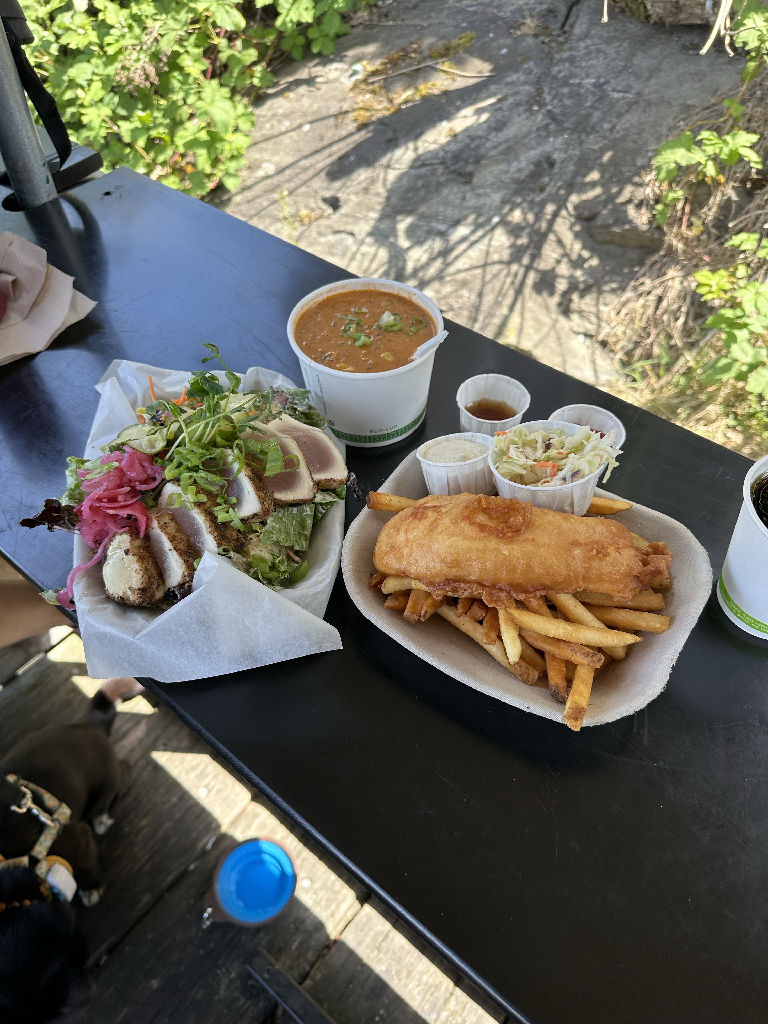 After Chinatown, we did a short drive over to the harbor and had lunch at Red Fish Blue Fish. They’re outdoors, so they were dog-friendly. I was surprised to see that salmon and cod were priced the same for their fish and chips! The fish was pretty juicy—not at all overdone. I also really liked their chowder, which tasted more like a coconut curry dish. We got the albacore tuna salad so we could get some veggies in us. Yummy!