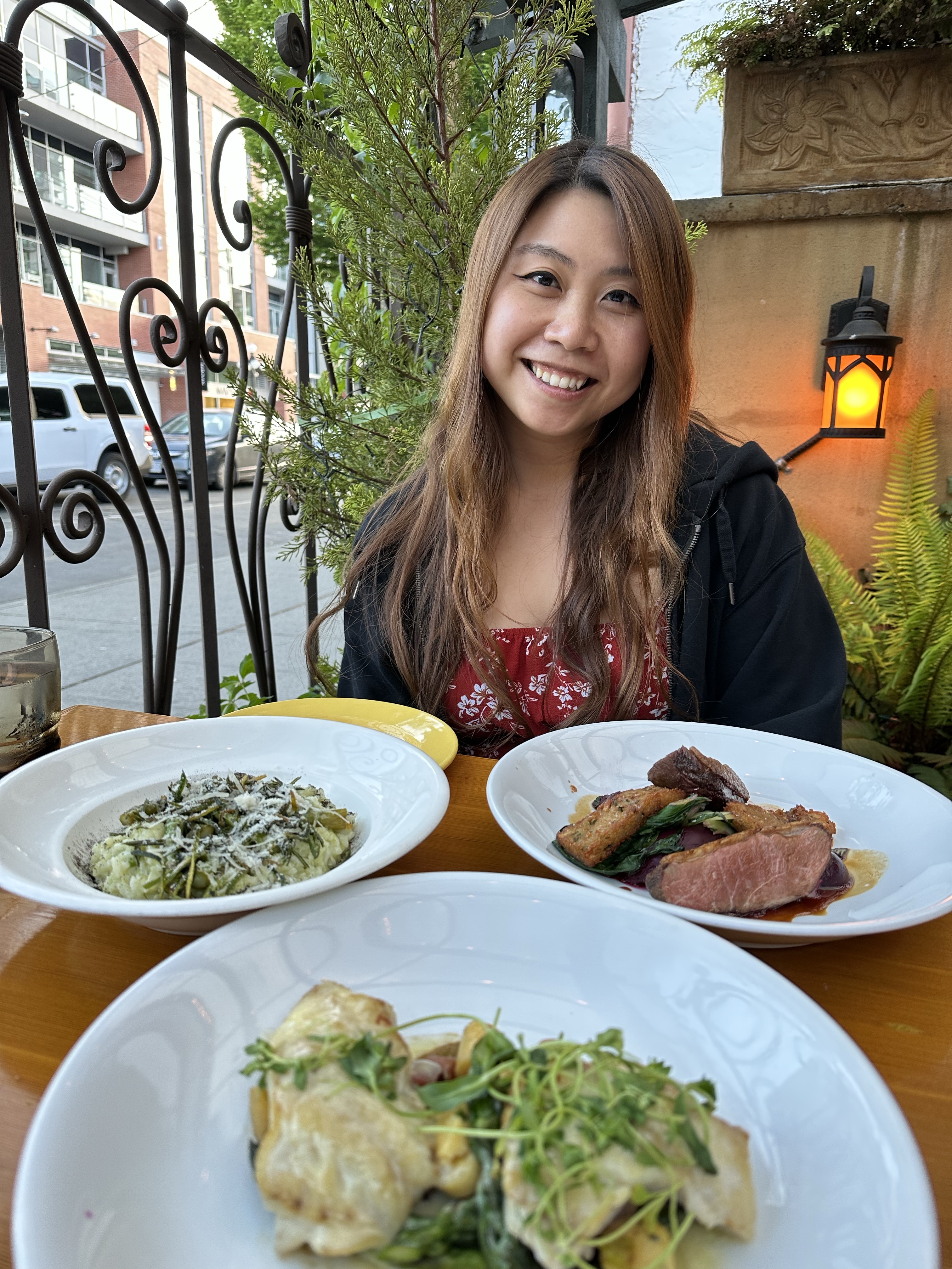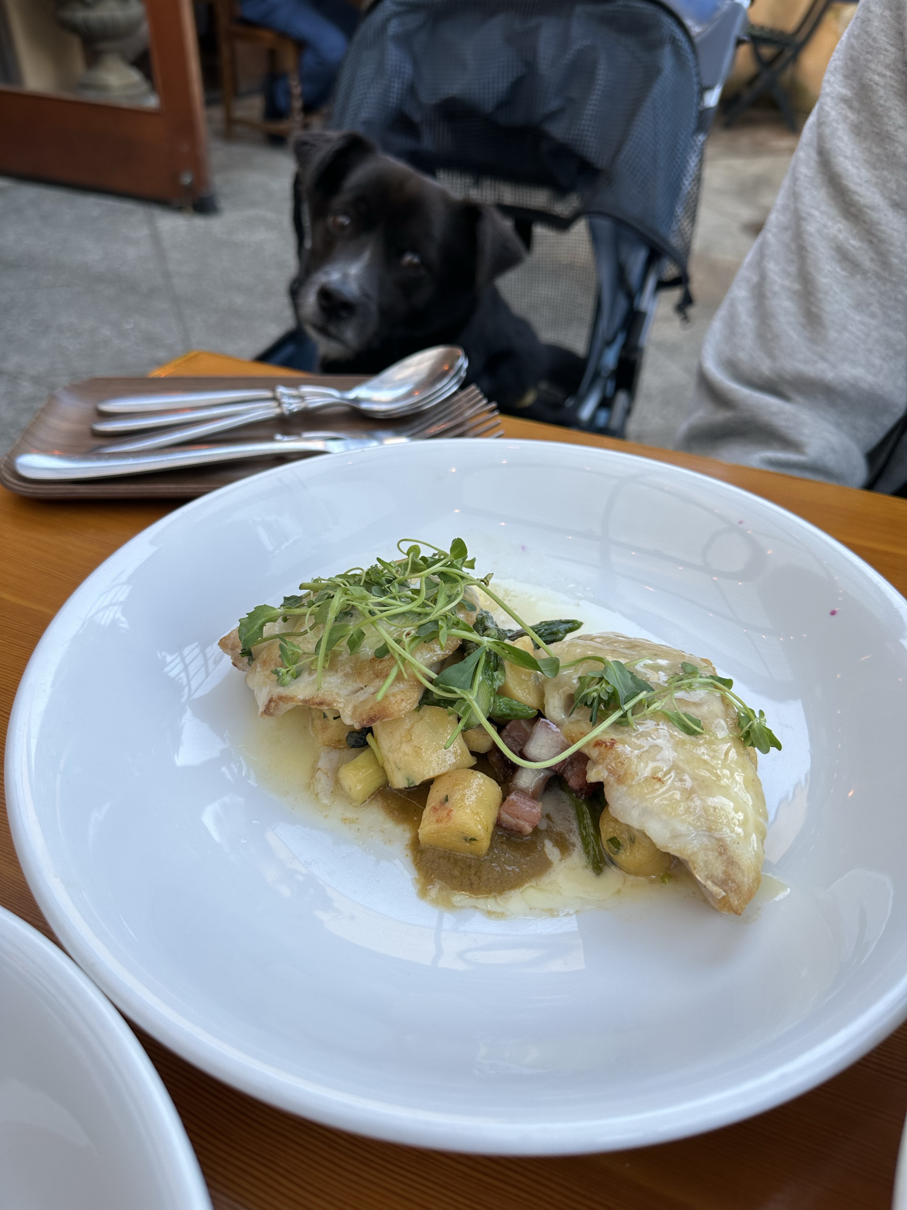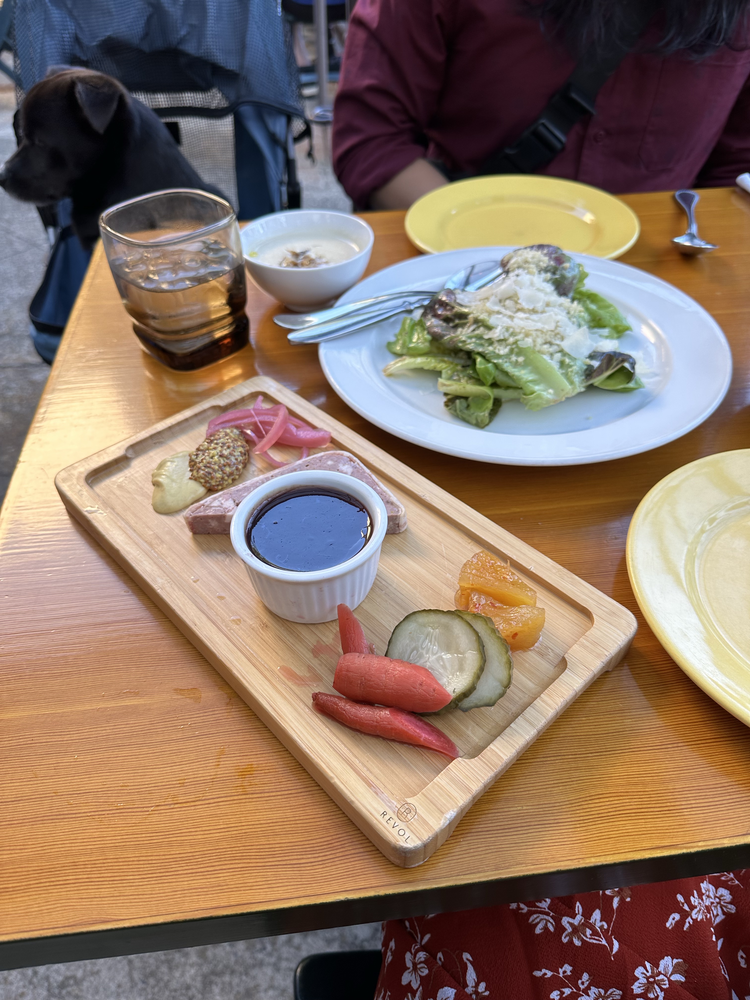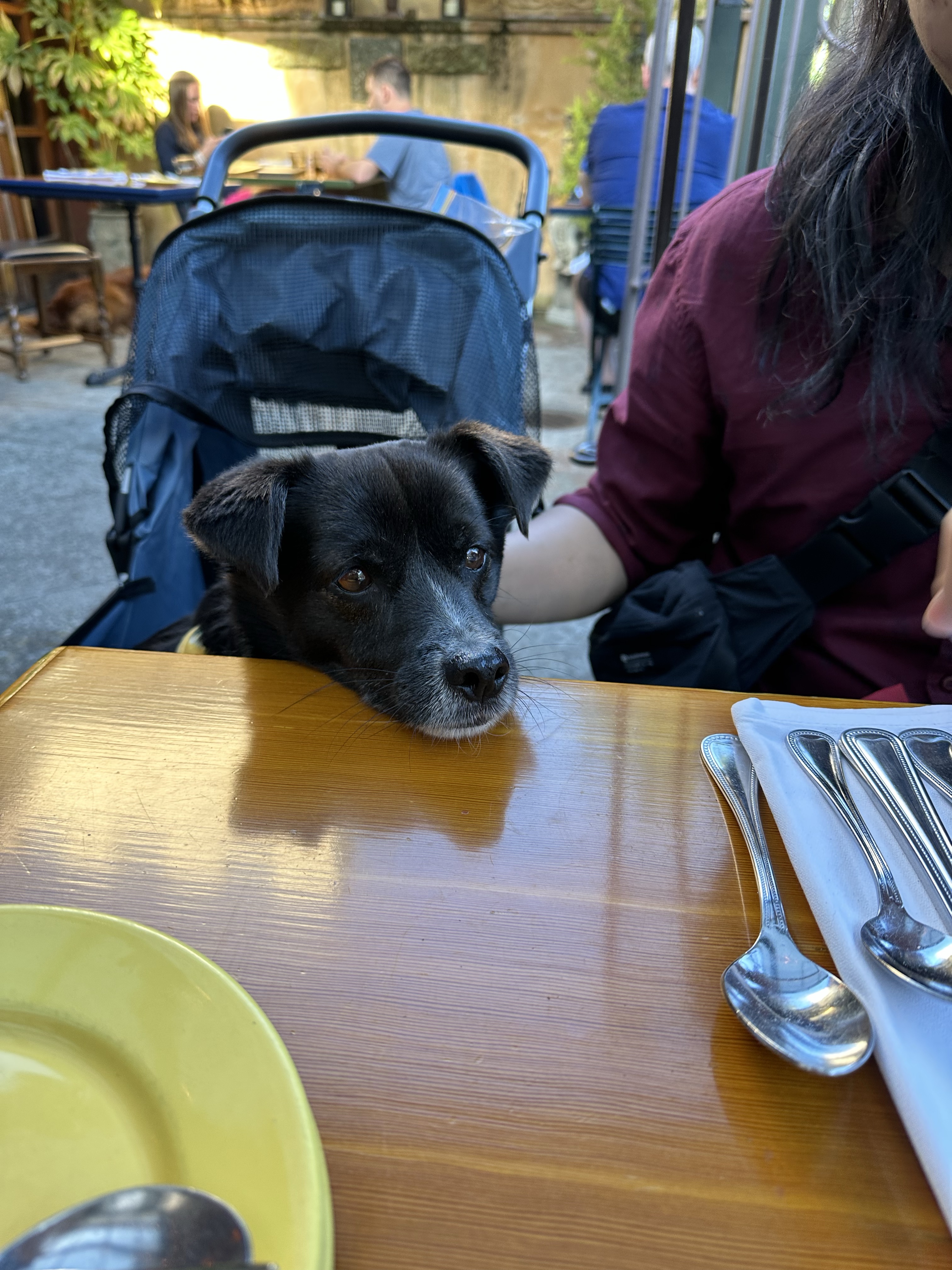 We headed back across the street to change after Miniature World. We had made a dog-friendly reservation at Café Brio! They don’t explicitly mention they’re dog friendly, but we called in ahead of time to reserve a seat on their outdoor patio. While we were there, another table brought in their two golden retrievers too. The restaurant staff were so lovely with Onyx, and they had even gotten a little water bowl out for him in advance of our arrival! We ordered the Brio Family Meal, in which we had a selection of 6 dishes chosen by the chef, served family style for the entire table. I actually loved the soup that they started us off with! The duck was a little overdone, but I know they were short staffed in the kitchen that day.