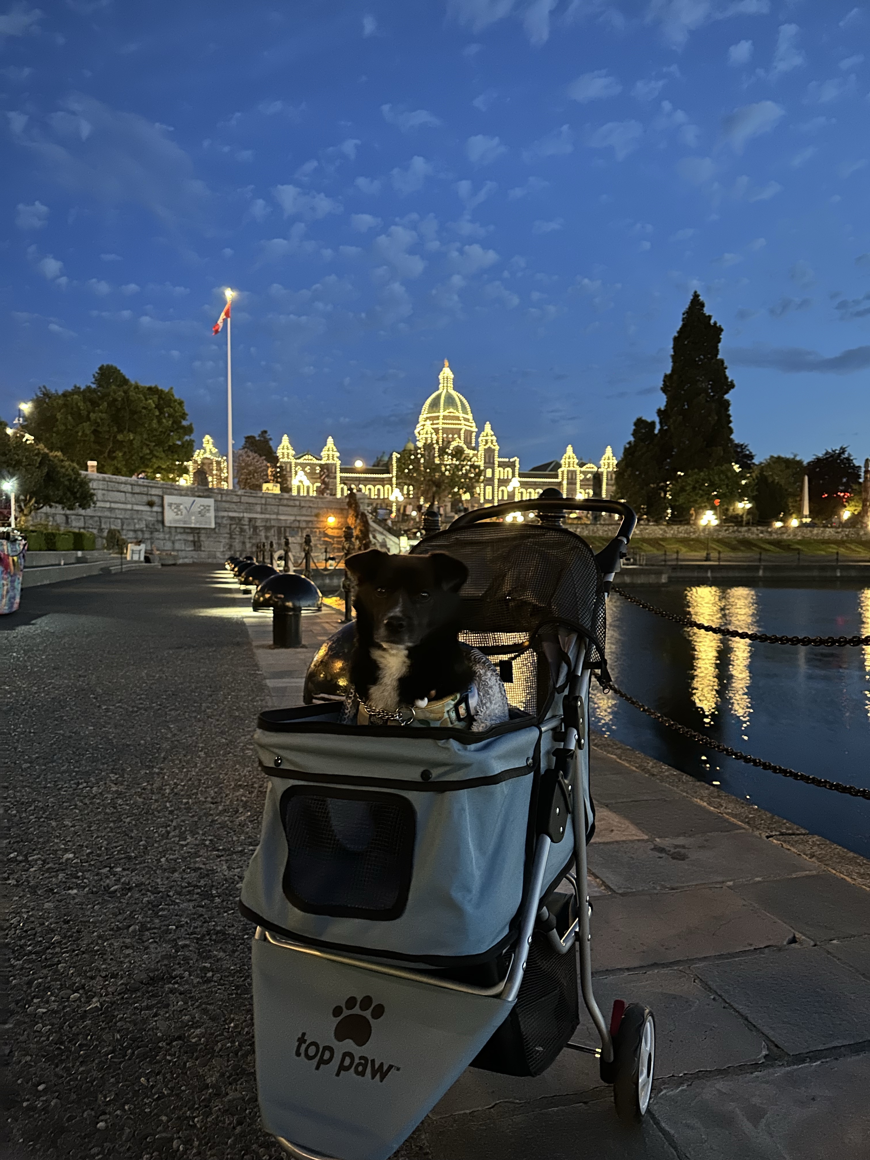 After dinner, we popped back to our hotel to grab a jacket and then headed down to the Victoria Marina area for a stroll. The sun was setting fast at this point, but we ended up getting a lovely view of the parliament and the Empress hotel lit up at night. We left after Onyx freaked out about seeing a horse in the streets and furiously started barking at them from afar. I’m not sure he’s ever seen a horse before, but I guess I can understand why a horse in the middle of the city could scare a dog. The above photo gallery shows the two pictures in which Onyx spotted the horse coming from afar, and then him starting to freak out—all while a nice boy was taking our group photo.