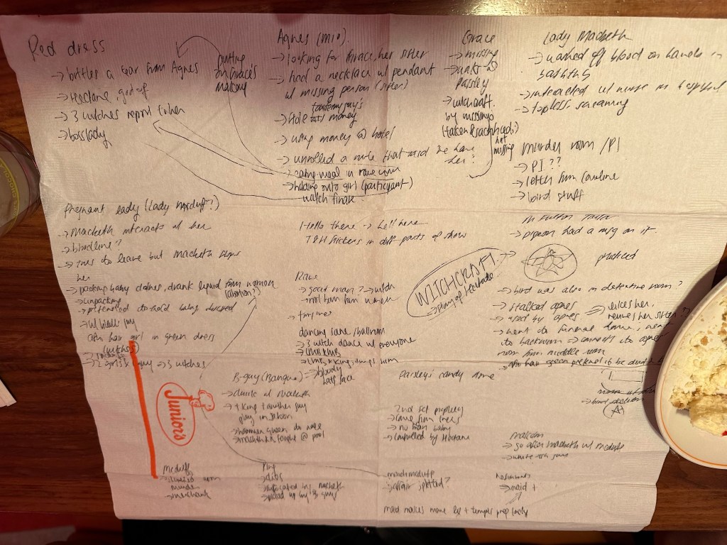 After the show ended, we then took an Uber to Junior’s Restaurant for some late night cheesecake. But most importantly, we wanted to debrief our various different experiences at Sleep No More. It ended up with us madly scribbling on a napkin and trying to recount what we saw. All of us saw different things, discovered different secrets, and by piecing together the experiences we were able to get a more holistic view of the story itself. My fiancé and I managed to stick together for much of this. But my sister got separated from her boyfriend almost immediately because the elevator host forced them to get off at different floors for the beginning.
