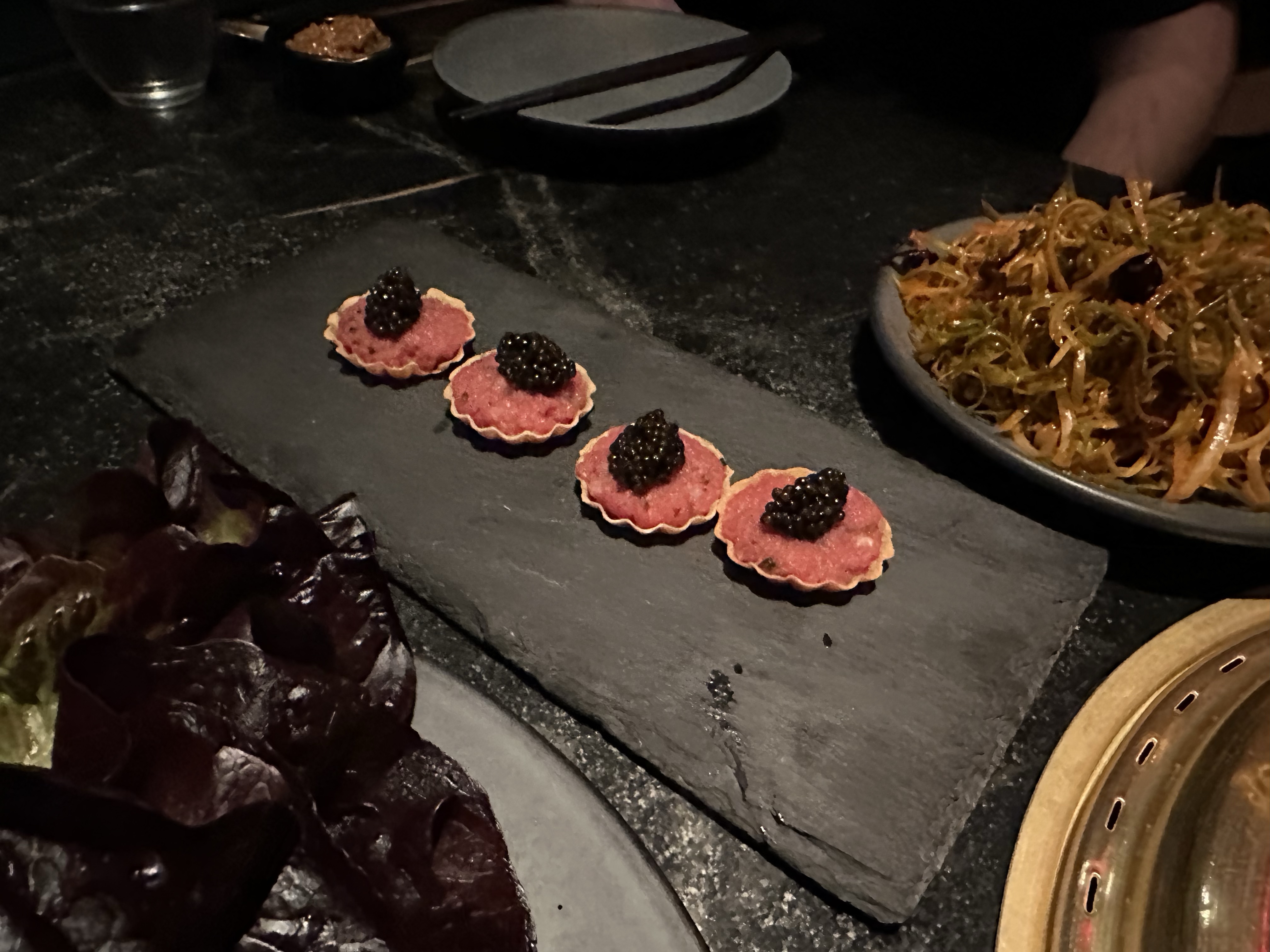 Right after fast food fried chicken, it was time for a little more elevated experience. Michelin starred Korean barbeque at Cote! We got their Butcher’s Feast and had a yummy assortment of meats that they grilled for us at our table. We had American wagyu, and while it was good, it was a far cry from Japanese wagyu. They gave us little jars of salt to take home after which was neat!