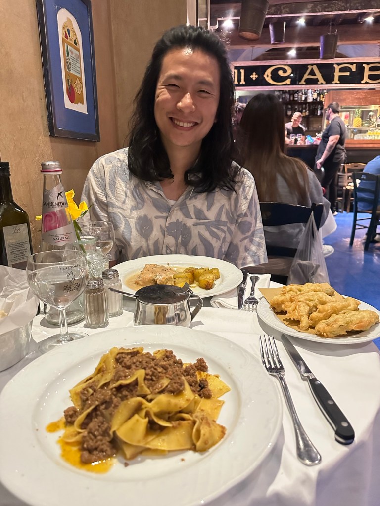 I have to say though — other than their antipasto platter, I didn’t like their food. We ordered their chicken in truffle cream sauce and their wild boar sauce pappardelle, and both of those were way too salty. Like so salty it got kind of gross and made our mouth feel weird. Their fried zucchini flower was fine. A bit disappointing given how popular this place seemed!