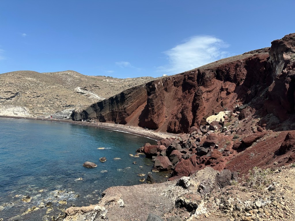 Getting to Akrotiri, we then had to walk from the archeological site toward the beach. It wasn’t a hard hike, but it was getting quite hot. Very neat to see the beach though, encircled by volcanic rocks. The sand itself is red-hued due to that too!