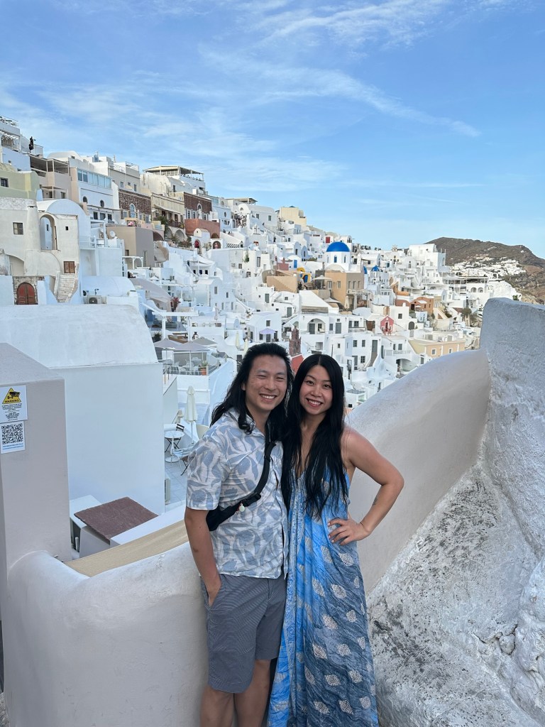 Then we did a quick walk up Fira’s winding roads again to see the caldera one more time. Early May is a wonderful time to visit Santorini and the crowds (according to Angelo and our driver) weren’t wild yet. In middle of summer, the island’s 20k ish residents have to accommodate 500k tourists. I think in the future I would like to come back in maybe April so it’s even a little less hot. Shops might be opened for shorter periods, and we might run into more issues with planes landing due to rougher winds. But even in early May, it was a tad hot for me. Still a lovely visit though and I’m so glad we got to go to Santorini during our honeymoon!