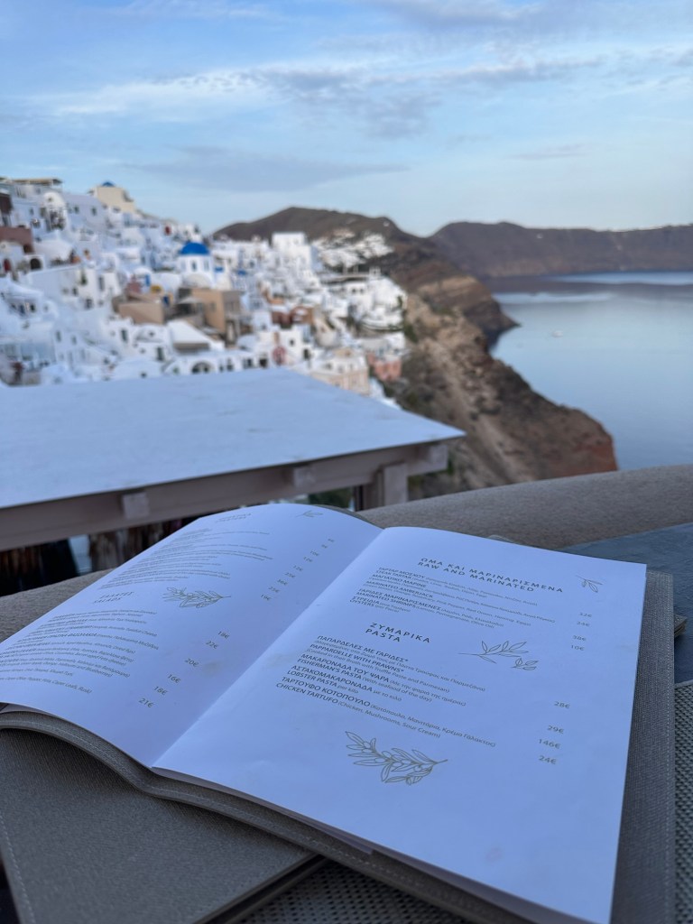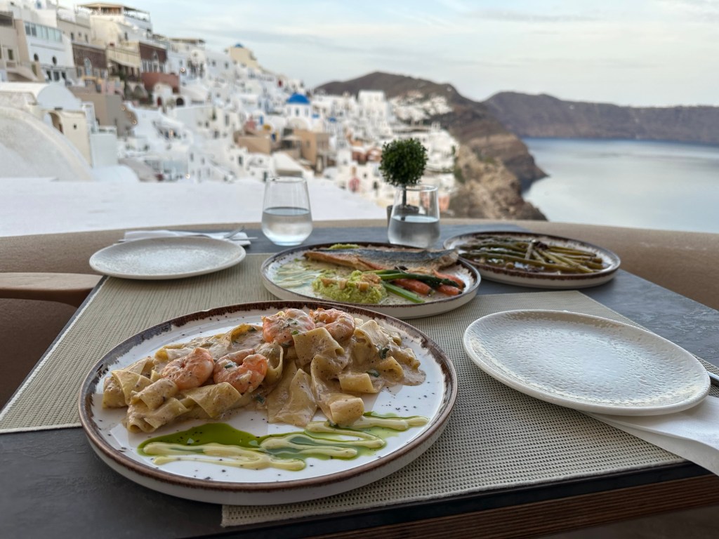 We had wanted to eat at Ammoudi Fish Tavern but they were undergoing some construction work via the city and had to refund our reservation (they’re so popular they charge you to make a reservation, which later gets credited to your bill). However, Angelo said he and his wife recently went to a restaurant called Emfasis that had nice views and good food. So we took his suggestion and booked a 7:30PM reservation so we could watch the sun set over Oia. Sunset was 8:10PM the day we were there. Emfasis indeed provided a beautiful view of the city and we’re glad we ate here (but it wasn’t cheap)!