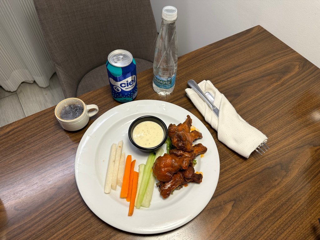 We ended the night by learning how to play Racing Demons in one of our rooms from my sister-in-law! Afterwards, S and I ordered late-night room service, which consisted of decaf coffee for him (he wanted to make an affogato in our room) and wings for me!