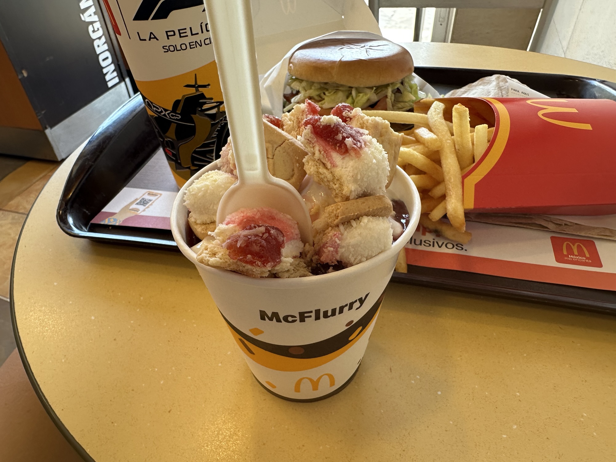 Since we didn’t eat lunch at the hotel, we got to eat at McDonald’s! We love checking out McDonald’s around the world to see what’s on their menu. We got the Club House burger from their Signature Menu, which tasted like a better Big Mac, but with tomatoes and two quarter-pounder (instead of hamburger) patties. They also had a limited-time Sponch McFlurry! I was excited about this because I love Sponch as a snack. It tasted great and they even had some strawberry sundae bits mixed in. I also enjoyed the apple soda drink they served there (Manzanita Sol)!