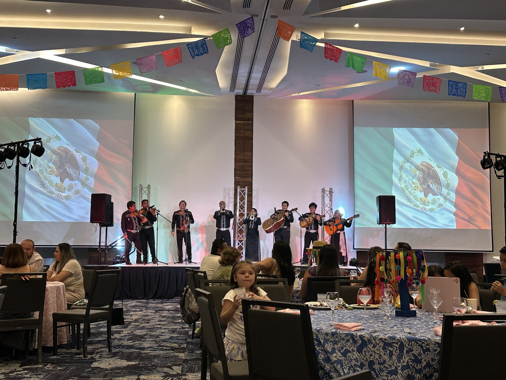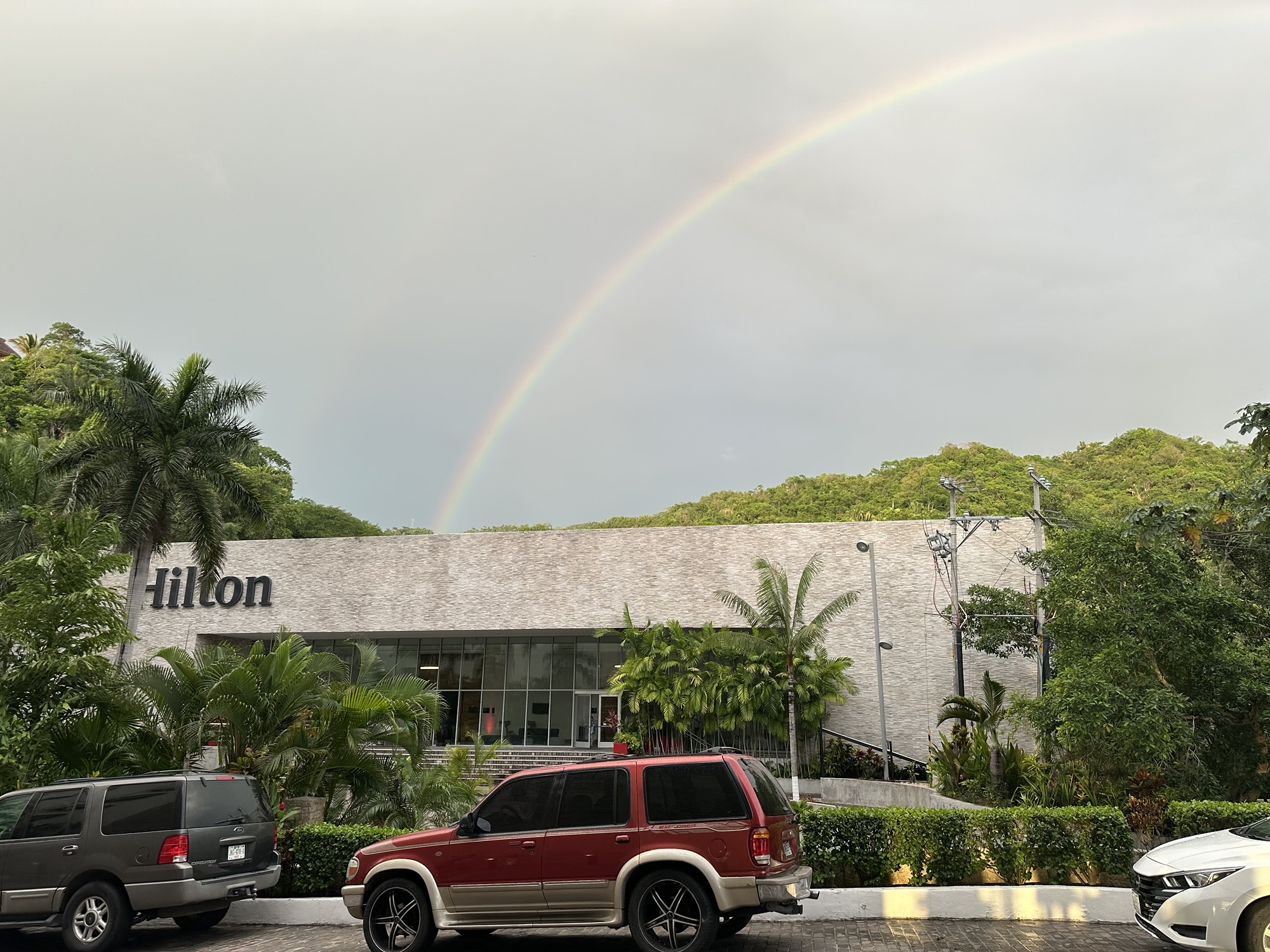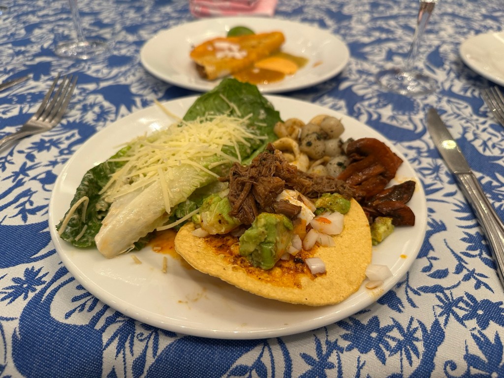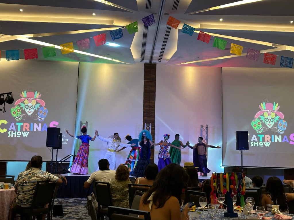 When we Uber-ed back to the resort, we ended up catching the tail end of the lunch buffet (that happened to be open that day??). So I ended up actually taking a nap when the others went to the steakhouse at 6 PM because I was a bit full and I didn’t want to deal with the lack of air conditioning. However, it was also because I knew the resort was hosting a Mexican party across the street at the Hilton Convention Center (look at the double rainbow that appeared as we were heading towards the convention center in the pic!) at 7:30 PM and there’d be a Mexican buffet there. They did not advertise this party very well because I had no idea it would be an entire dinner and show experience! It was awesome when we got to listen to a Mariachi band and then watch a Catrinas show. The food at this buffet was better than Maxal. I had Mexican street corn, birria tacos, and more! It was a lovely last dinner at the resort!