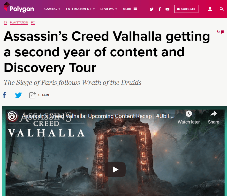 Article – Coverage on the announcement for a 2nd year of support for Assassin’s Creed Valhalla and the upcoming release of Discovery Tour: Viking Age I did at Ubisoft Forward for E3 2021.