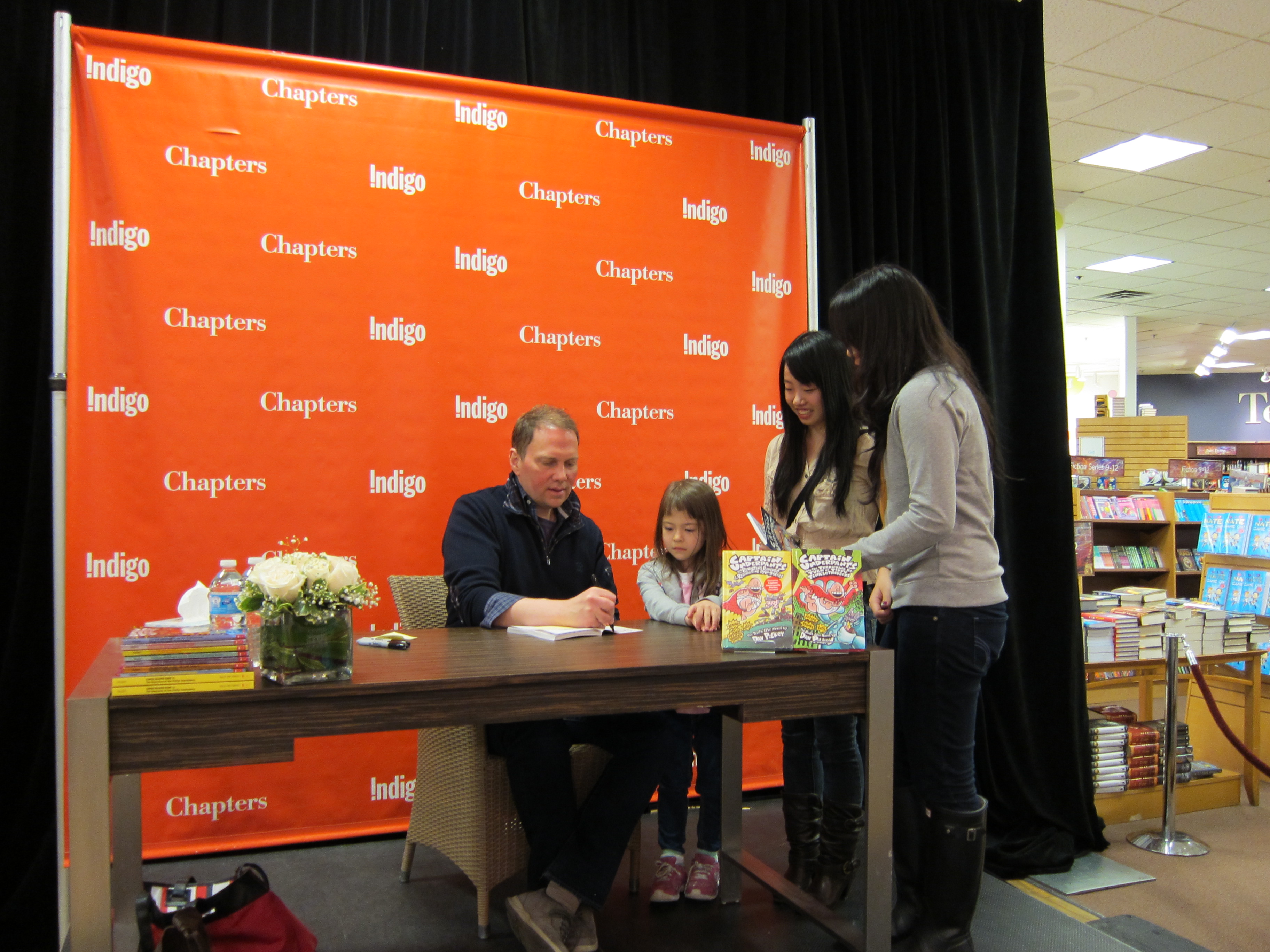 My friend and I were at Chapters one time, and we saw a poster that advertised a book signing. Dav Pilkey was coming to Metrotown for a book signing!