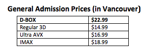 I was a bit nauseous at the beginning, but that eventually went away. There were some unnecessary movements (did we really need vibrations when Thor ran up the stairs? Arguably not.). It also costs more than your regular ticket (made a chart for your reference– Oo! Look at me being all fancy!).